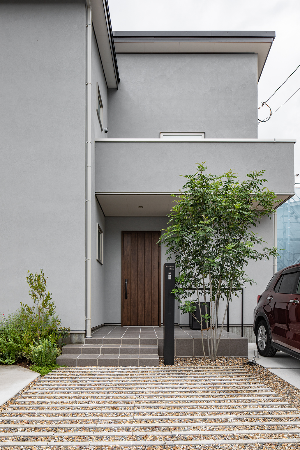 外観のフォルムと薄いグレーの色味にこだわったのは奥様。上品で落ち着いた色は植栽のグリーンや外構が美しく映える。
