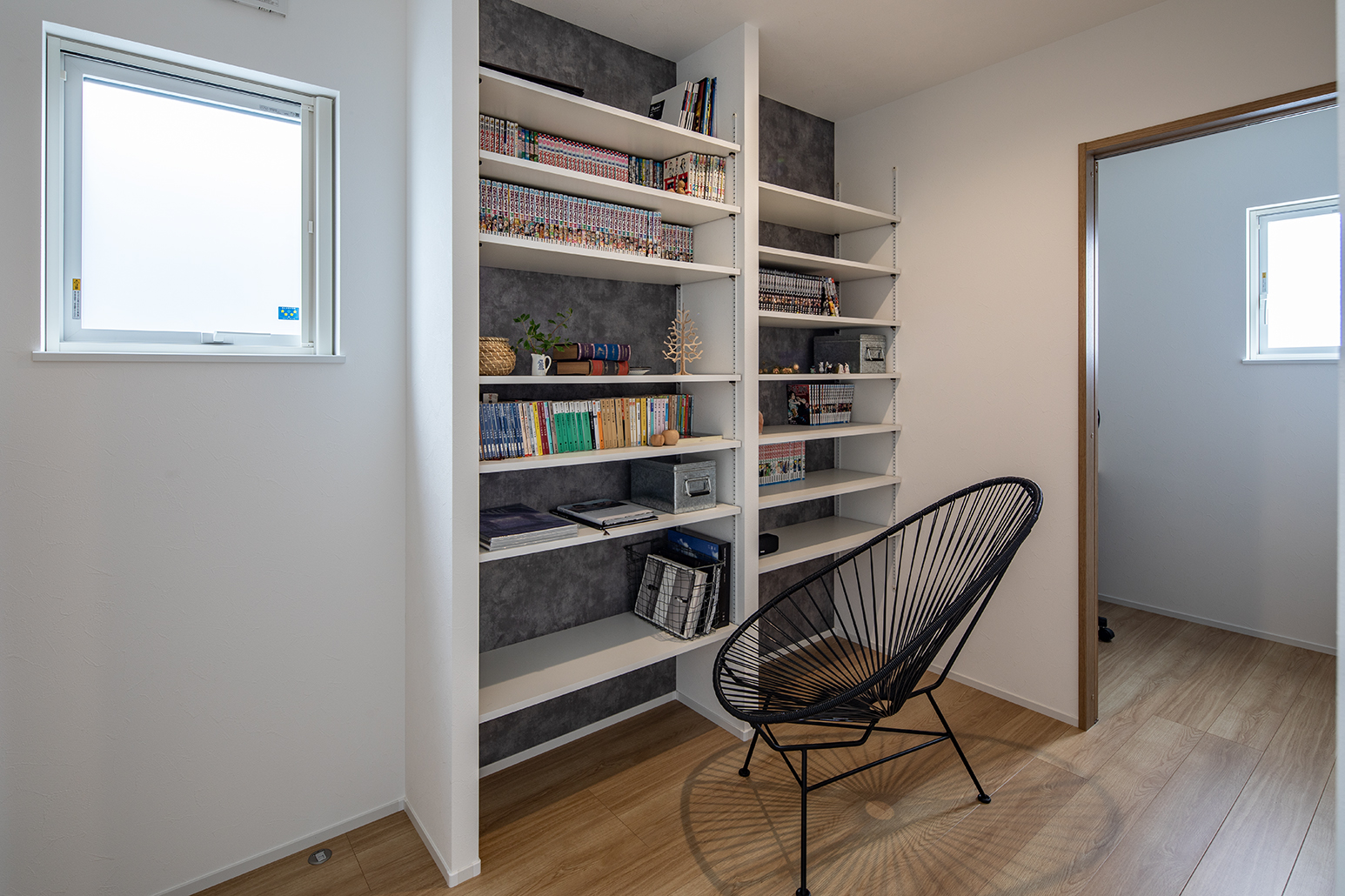 2階のホールにつくったライブラリーコーナー。「以前住んでいた家は収納量が少なかったけど、ここならまだ余裕がありますね」とご主人はうれしそう。奥はご主人の書斎。
