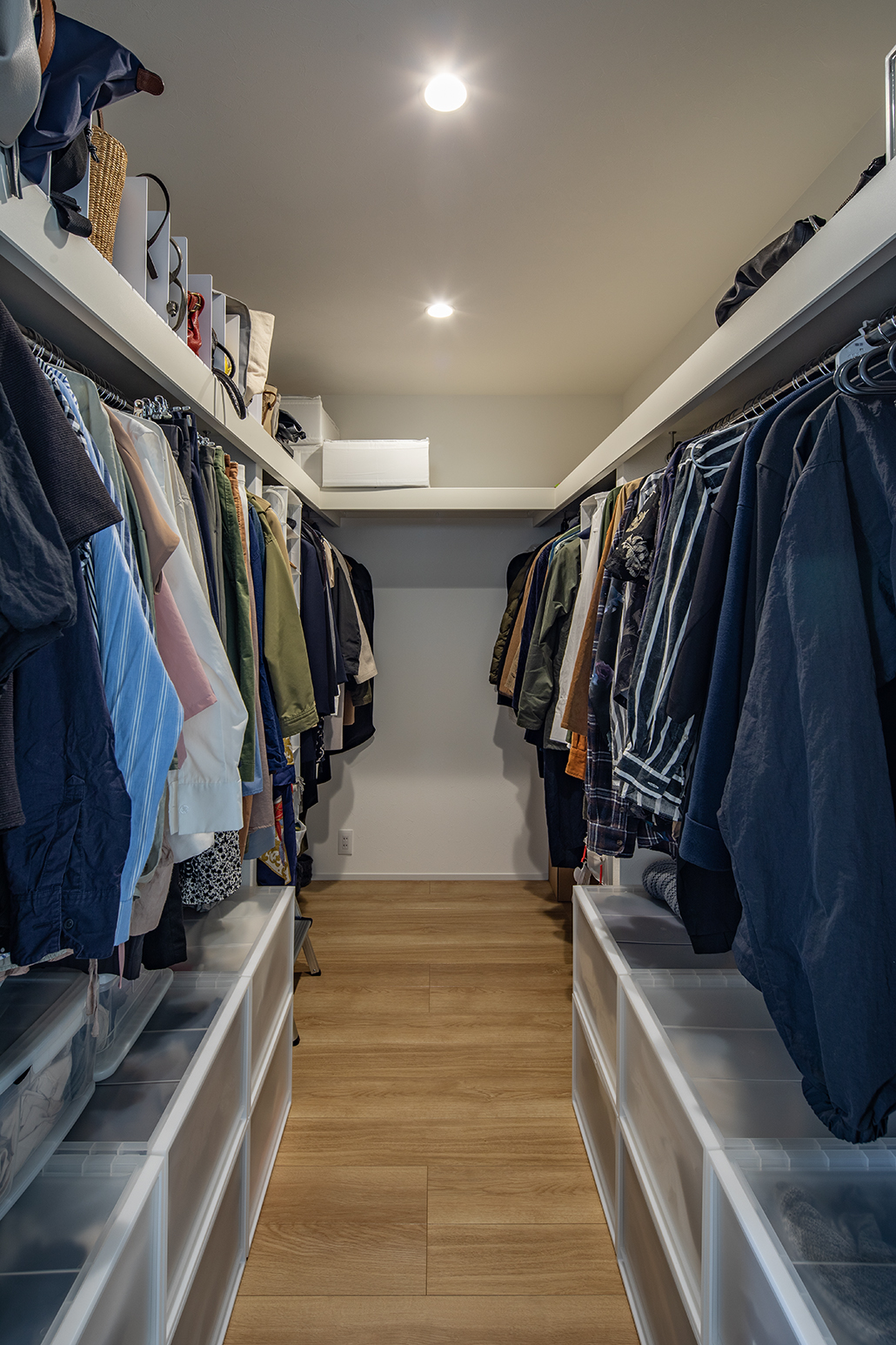 ご夫婦ともに洋服が多いため、大容量のクロゼットを設けてまとめて収納。