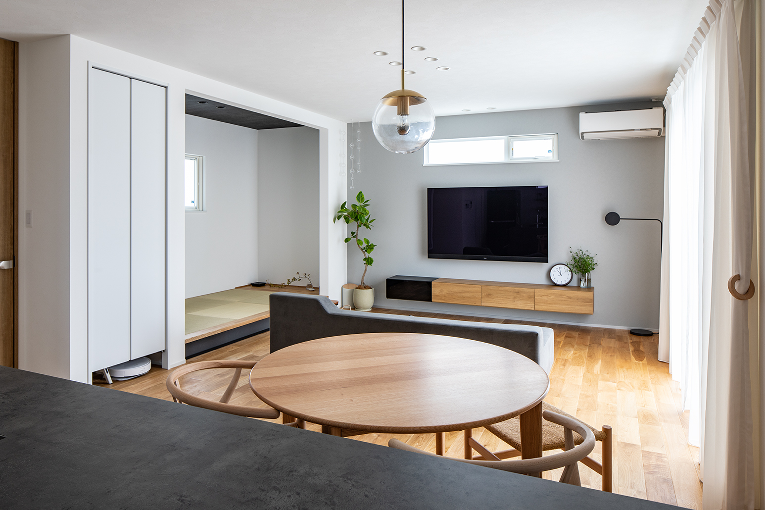 キッチンから見たリビングダイニング。すっきりとしたテレビまわりは、お気に入りのインテリアがよく映える。左の収納扉の下はロボット掃除機の収納スペース。