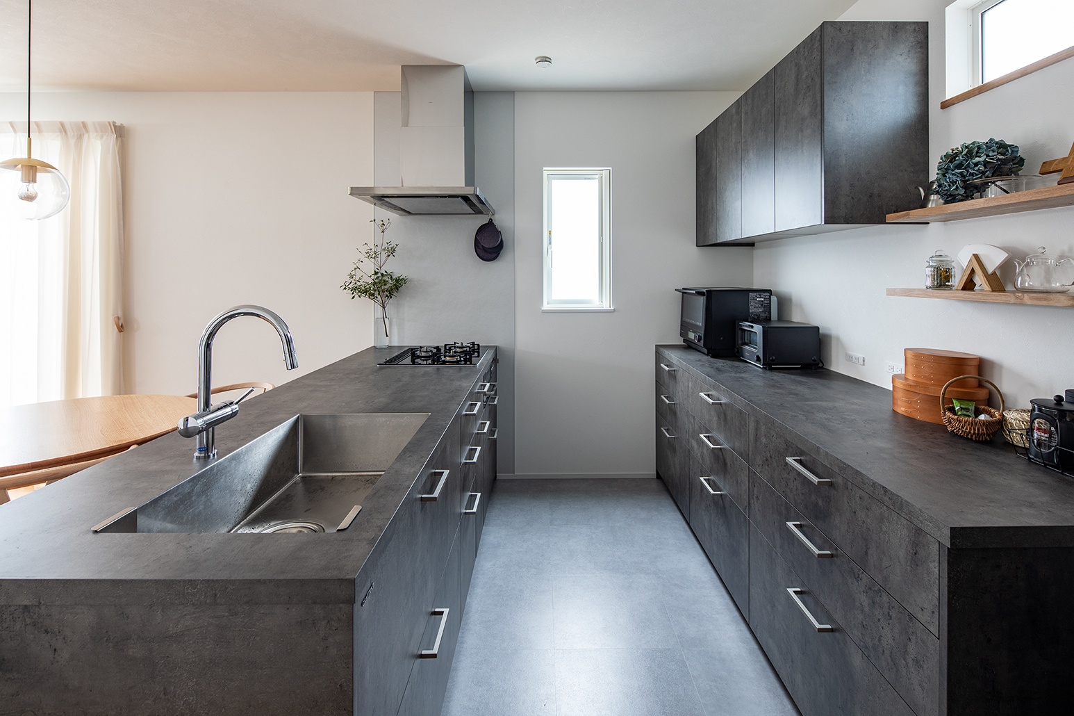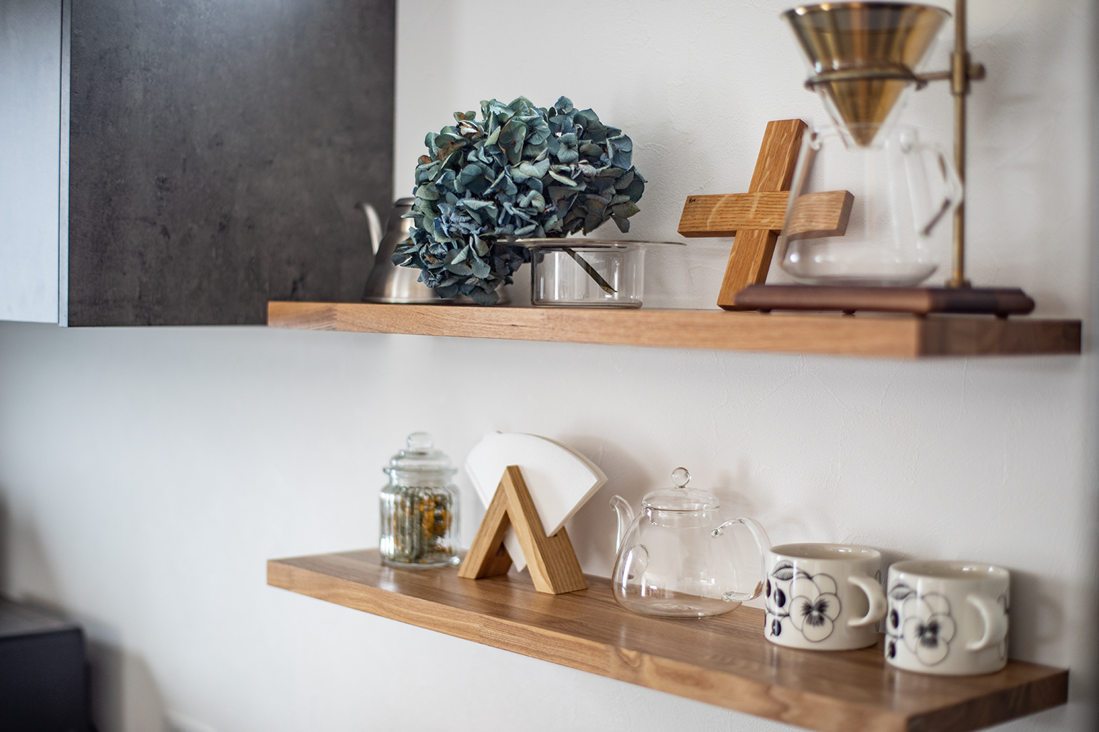 奥様が気に入っているキッチンは家電を黒で統一し、木製の棚には厳選したインテリア雑貨を並べた。背面も合わせると収納量はたっぷり。