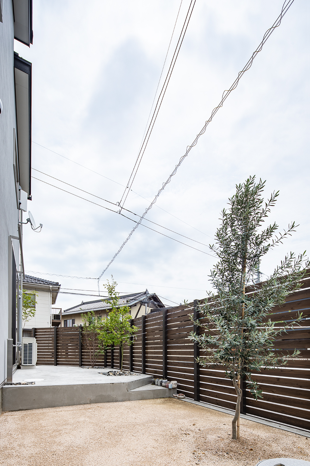「バーベキューをしたり椅子に座ってのんびりしたいから」と設けたテラスは掃除が簡単なコンクリートタイプに。
