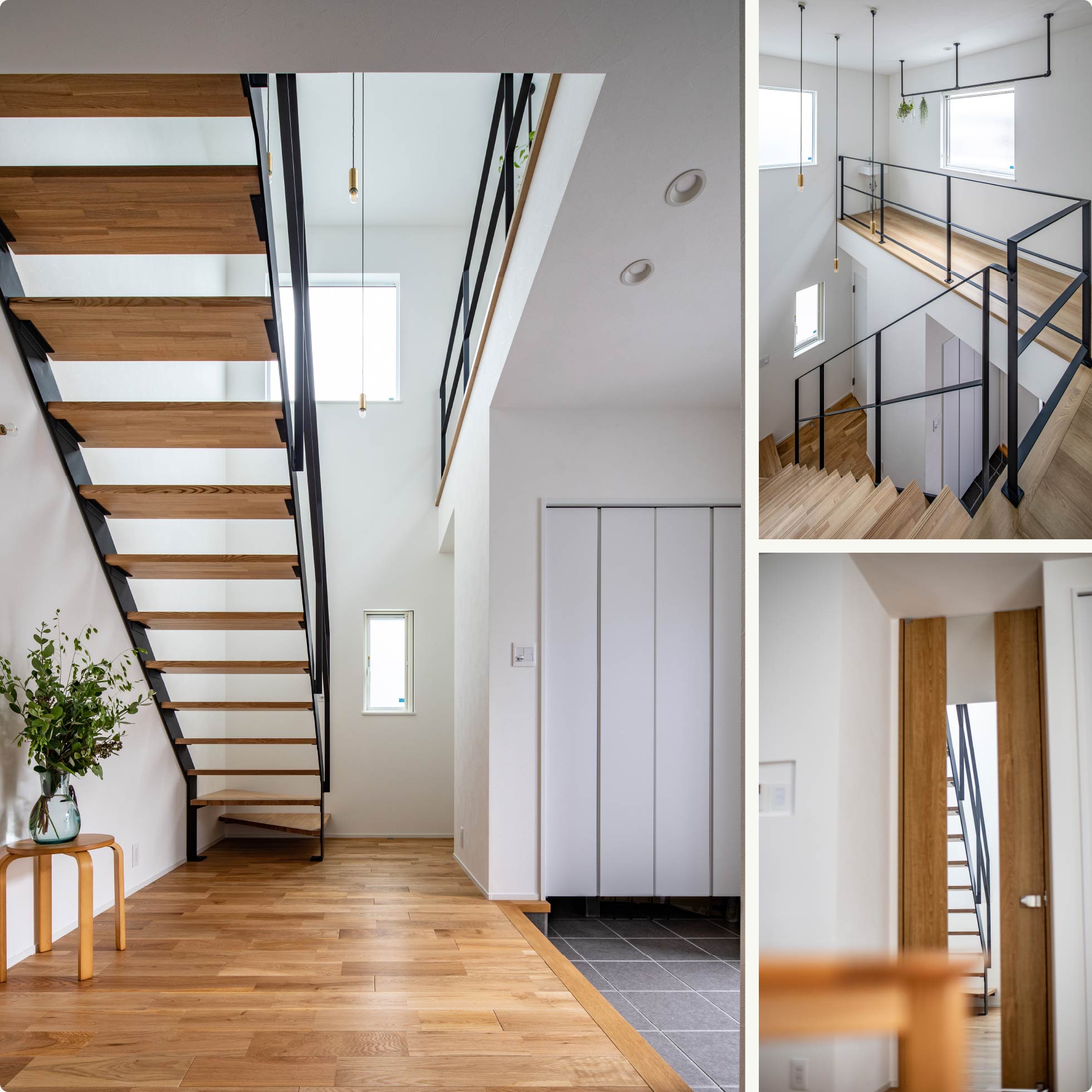 明るい陽光が入る玄関ホール。「家に帰ったとき、うれしくなります」とご夫婦は話す。リビング扉のガラス部分から見える階段の「チラッと見える感じが好き」と奥様。2階のホールには物干しコーナーもつくった。