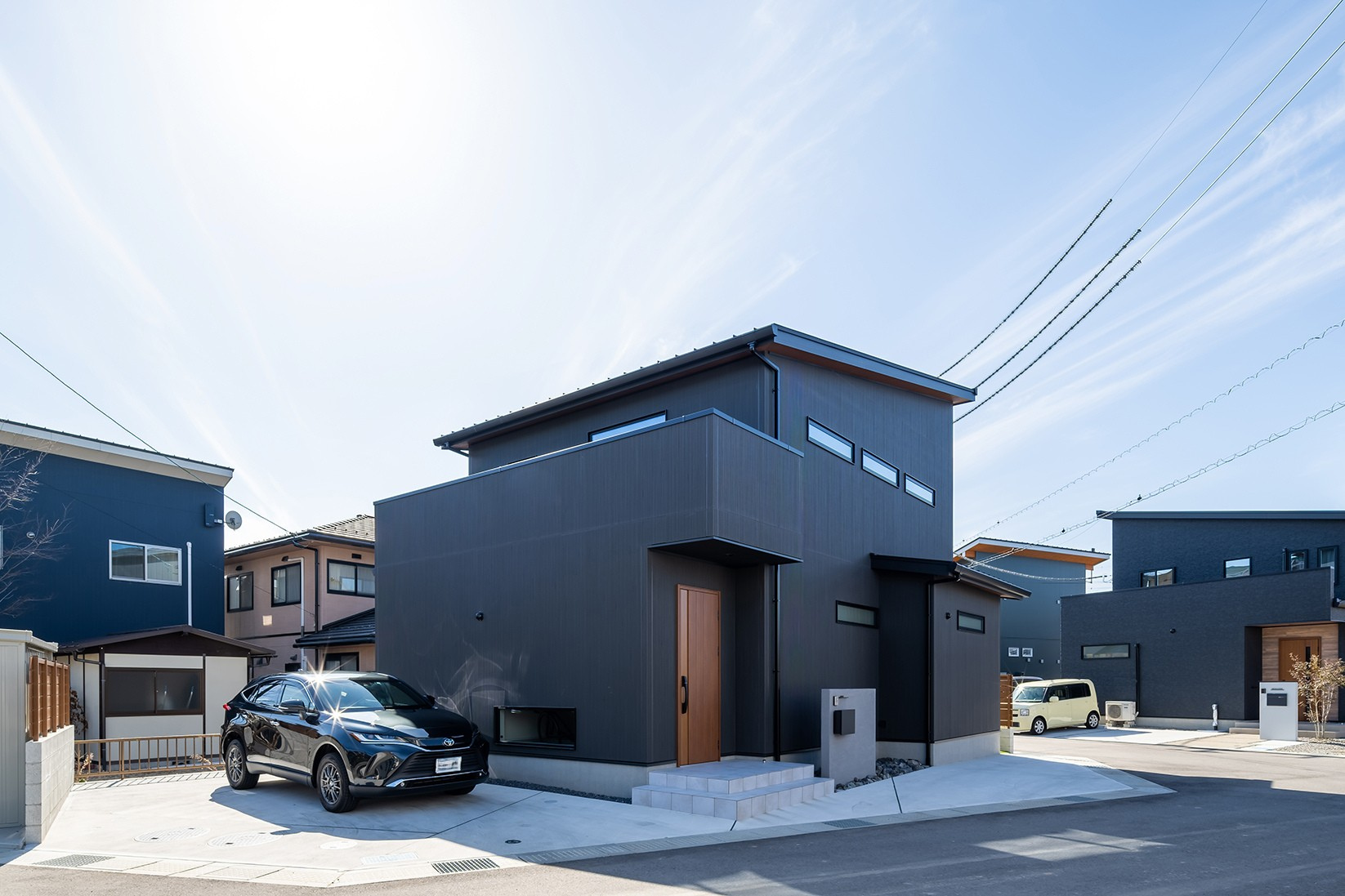 高級感のあるモダンな外観。」スタイリッシュな片流れ屋根に、外壁は光触媒コーティングで汚れを分解する機能もプラス。