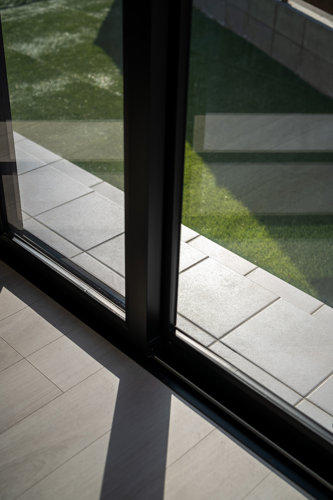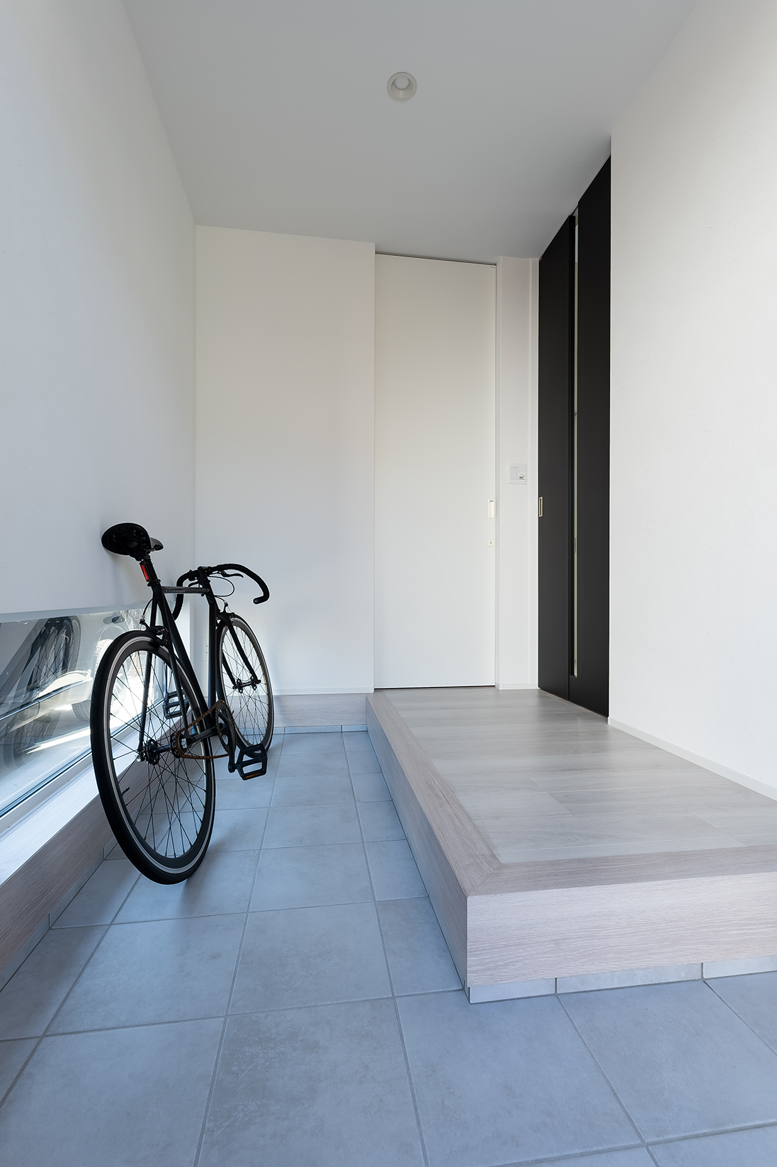 地窓を設けて明るさを確保。自転車が置けるように土間を広くしている。