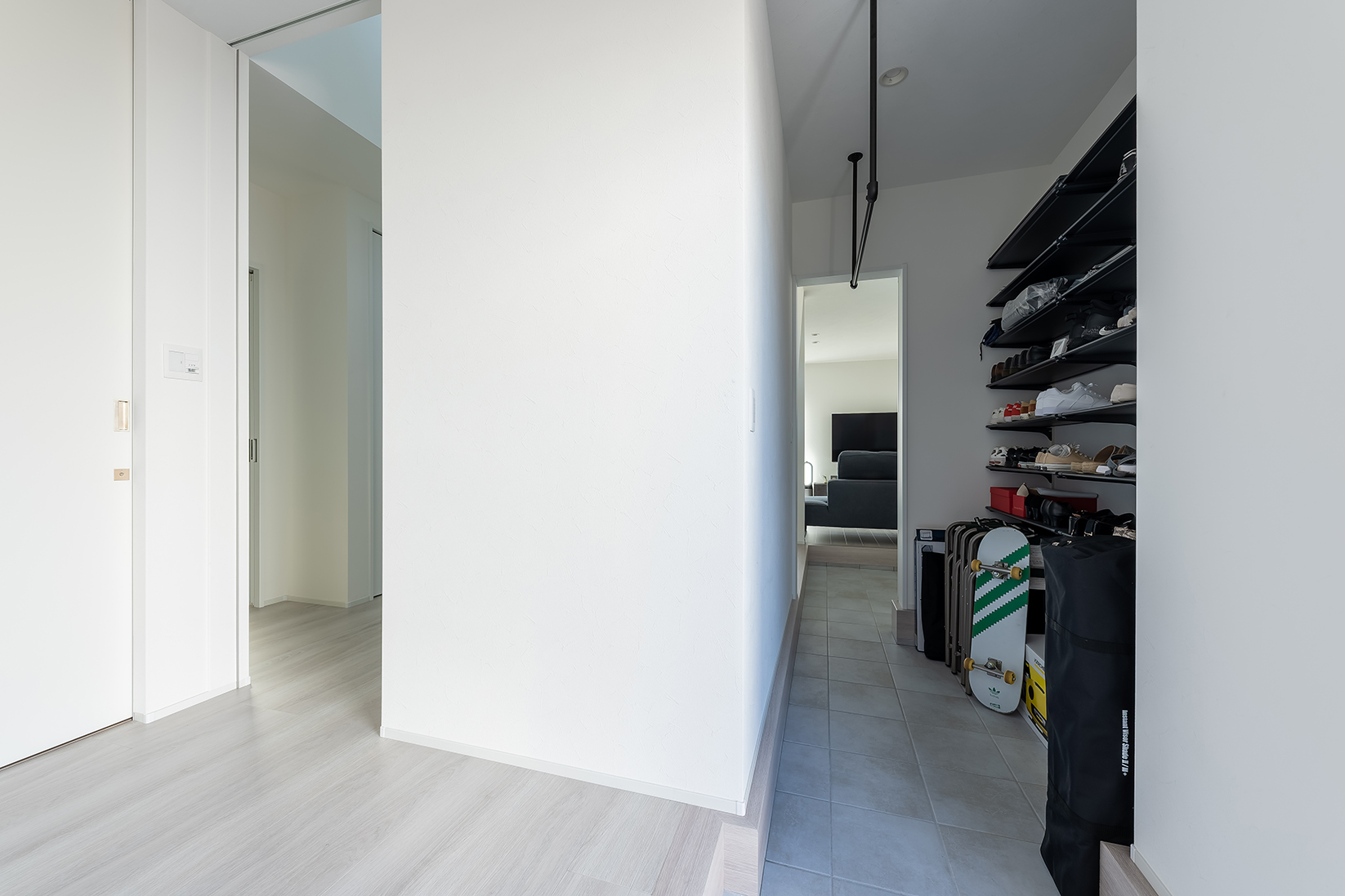 玄関ホールから室内への入り口は上吊り引き戸のハイドアに。シューズクローゼットはウォークスルースタイルでリビングへの動線もあり便利。