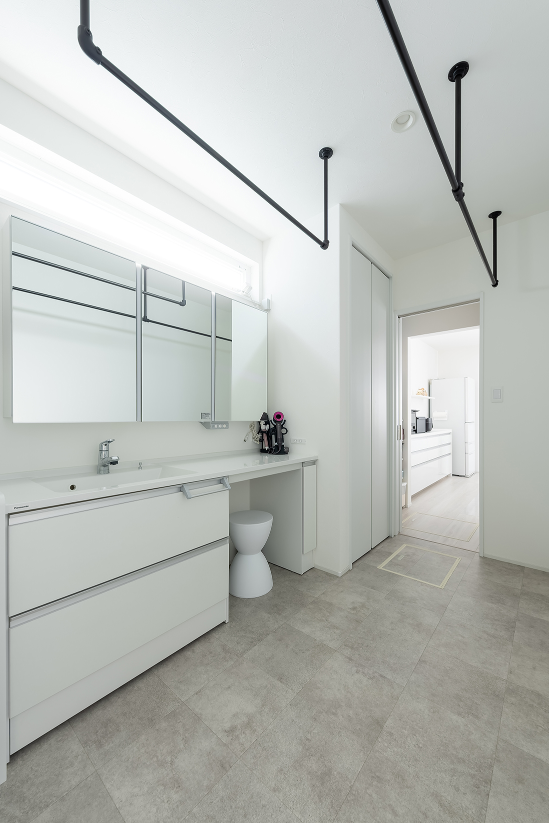 広さ4帖超えの洗面脱衣室は、アイアン製の物干しを設けたのでランドリースペースとしても活用できる。