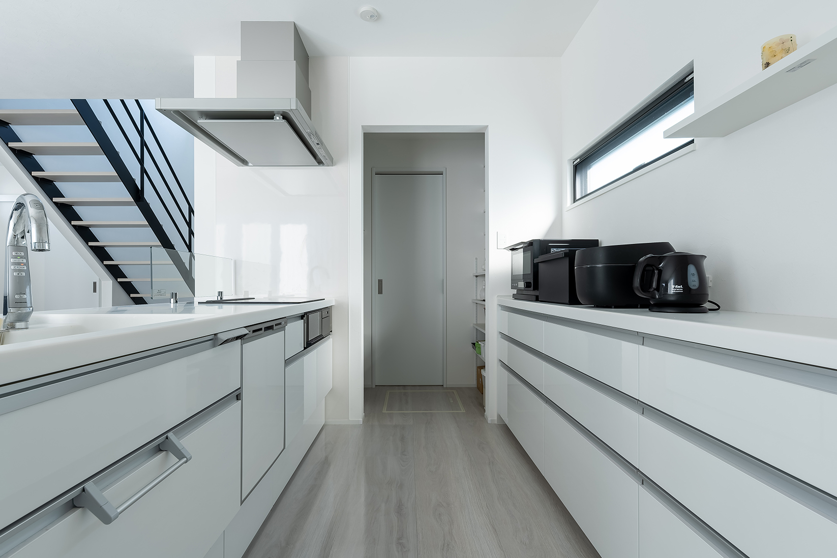キッチン横にパントリーを配し、さらに洗面脱衣室につながる動線で家事ラクを実現。