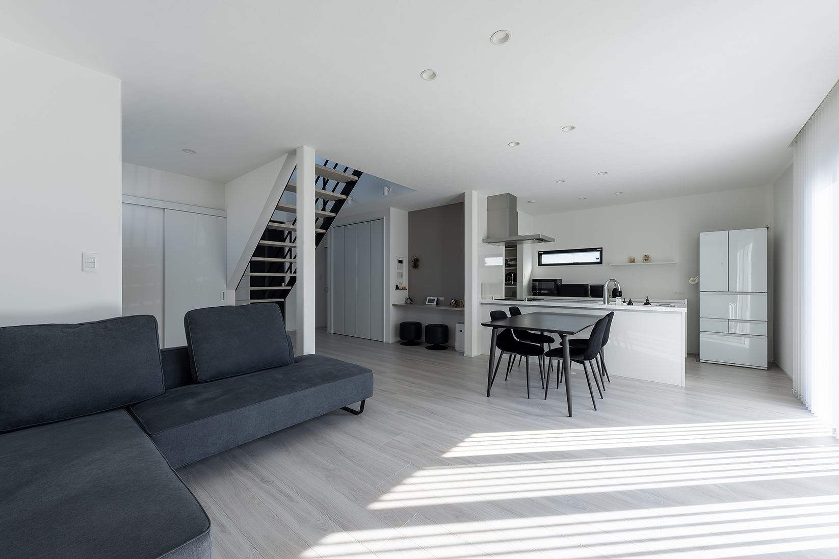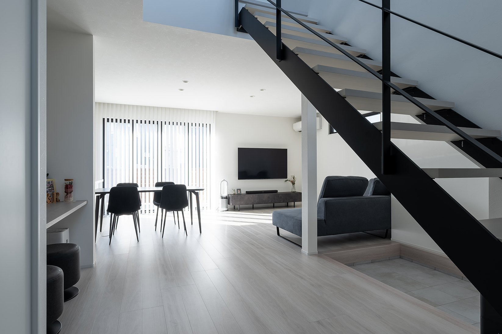 ブラインドから差し込む光とモノトーンのインテリアが美しいLDK。リビング階段にしたことで、家族の帰宅や外出が確認しやすい。