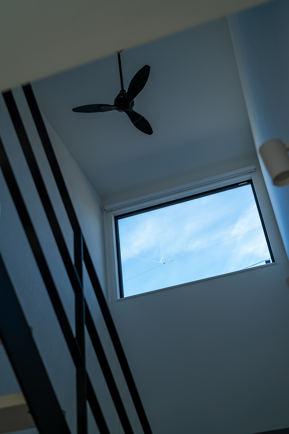階段に自然光を採り入れる大きなFIX窓を設けた。