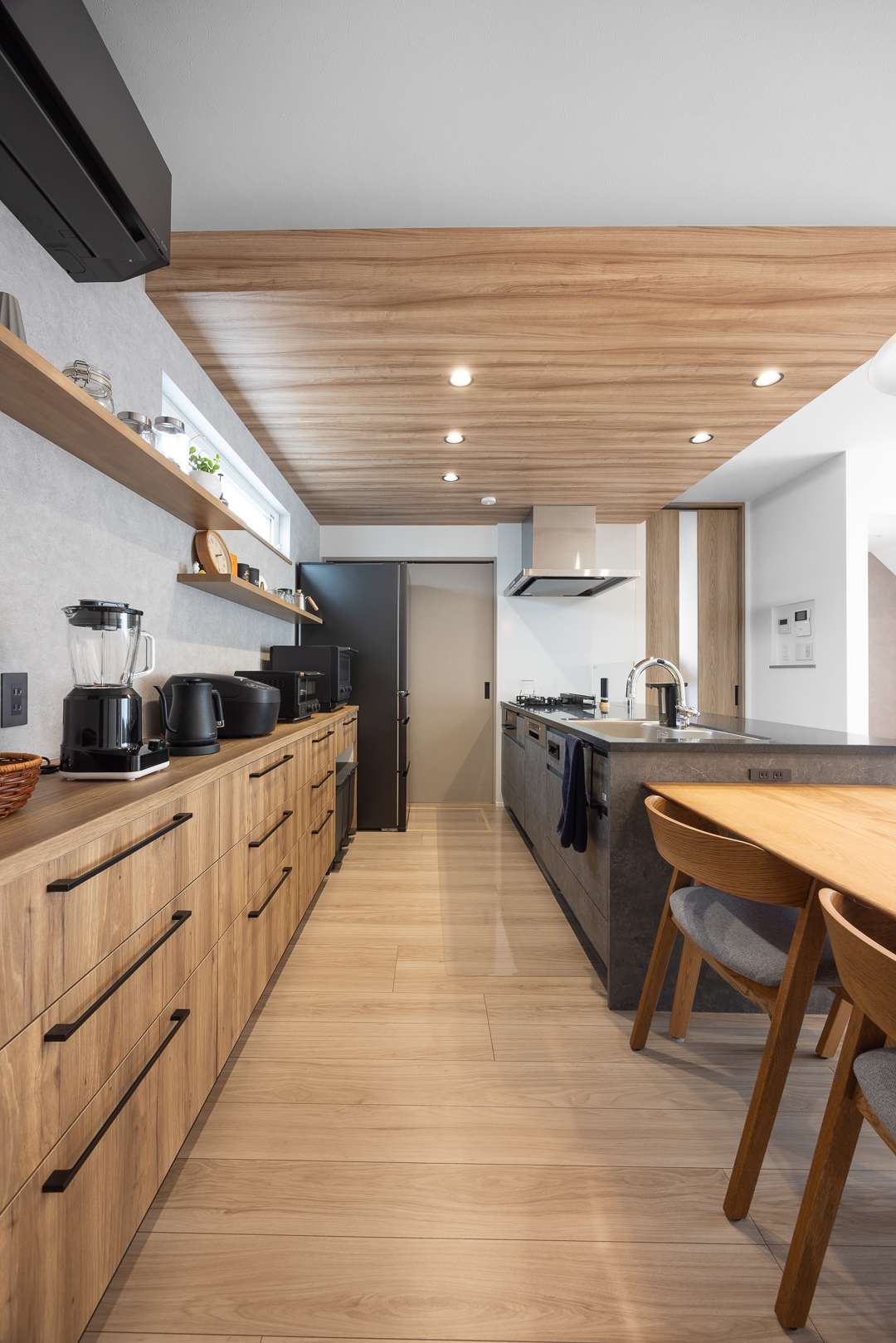 グレーのフラットキッチンとブラック家電が映える空間。木目収納との調和で上質な雰囲気に仕上がった。