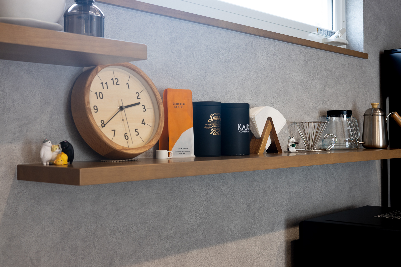 オープン収納にお気に入りのコーヒーアイテムと小物を並べて。日常に楽しみを添える見せる収納。