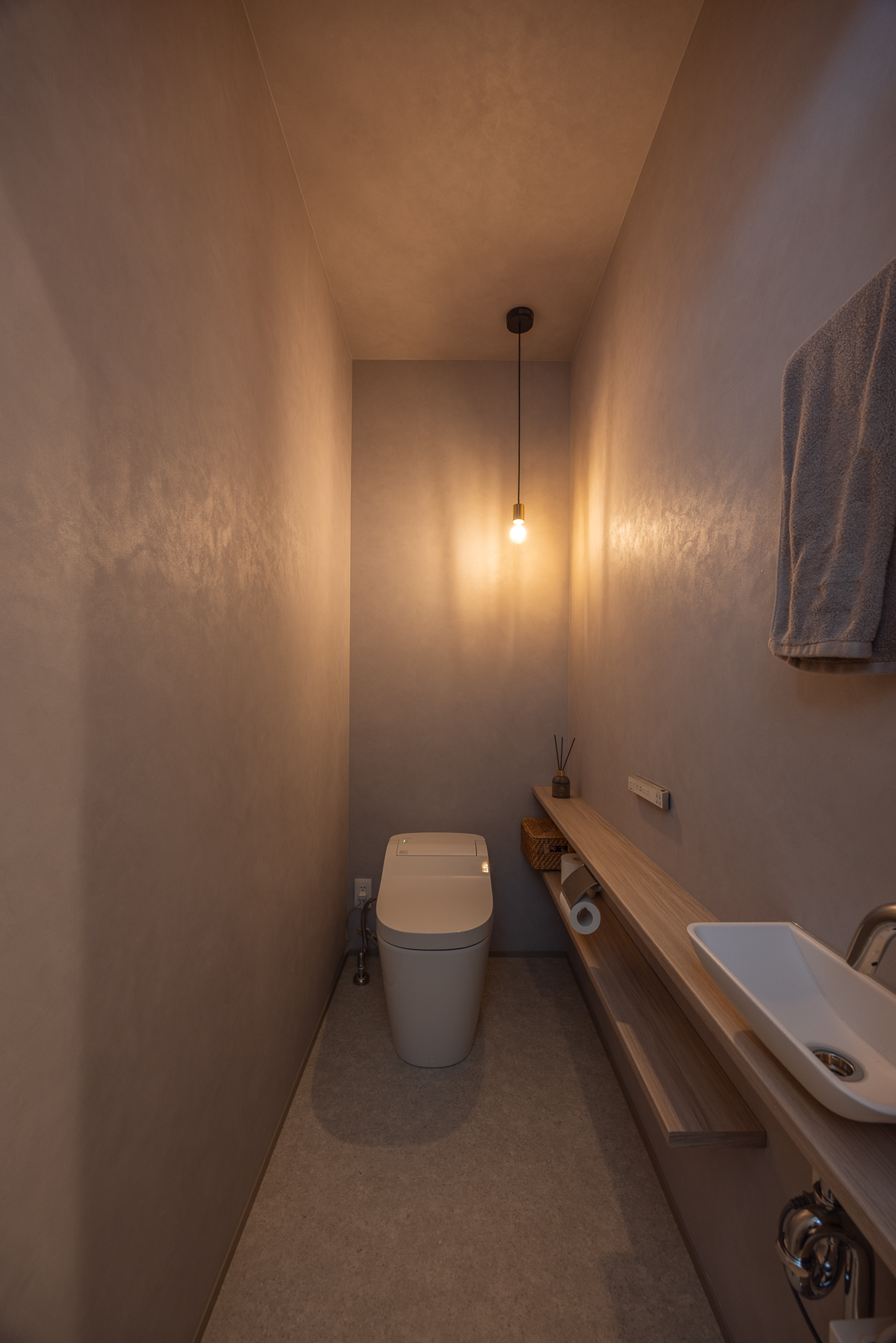 落ち着いた色味のクロスと間接照明で落ち着きのある空間に。小物を置ける棚があり実用性も兼ね備えている。