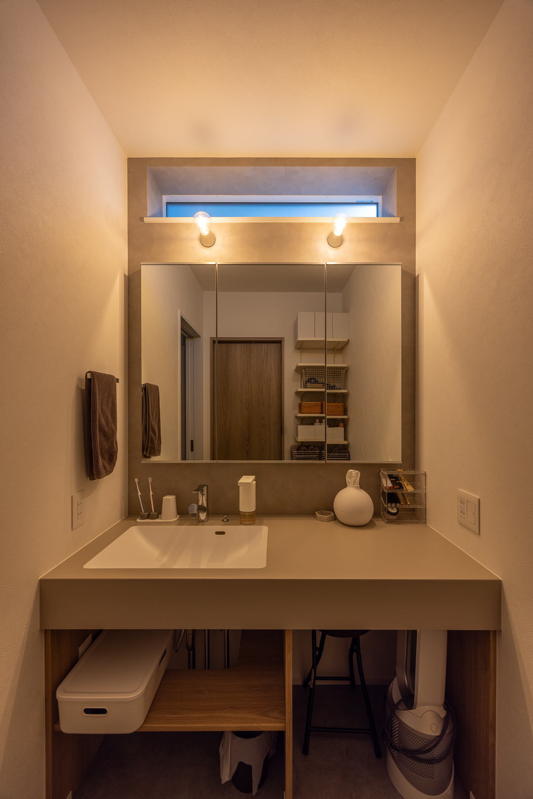 ホテルのような落ち着きがあり、お風呂上がりを上質な時間にしてくれる洗面。
