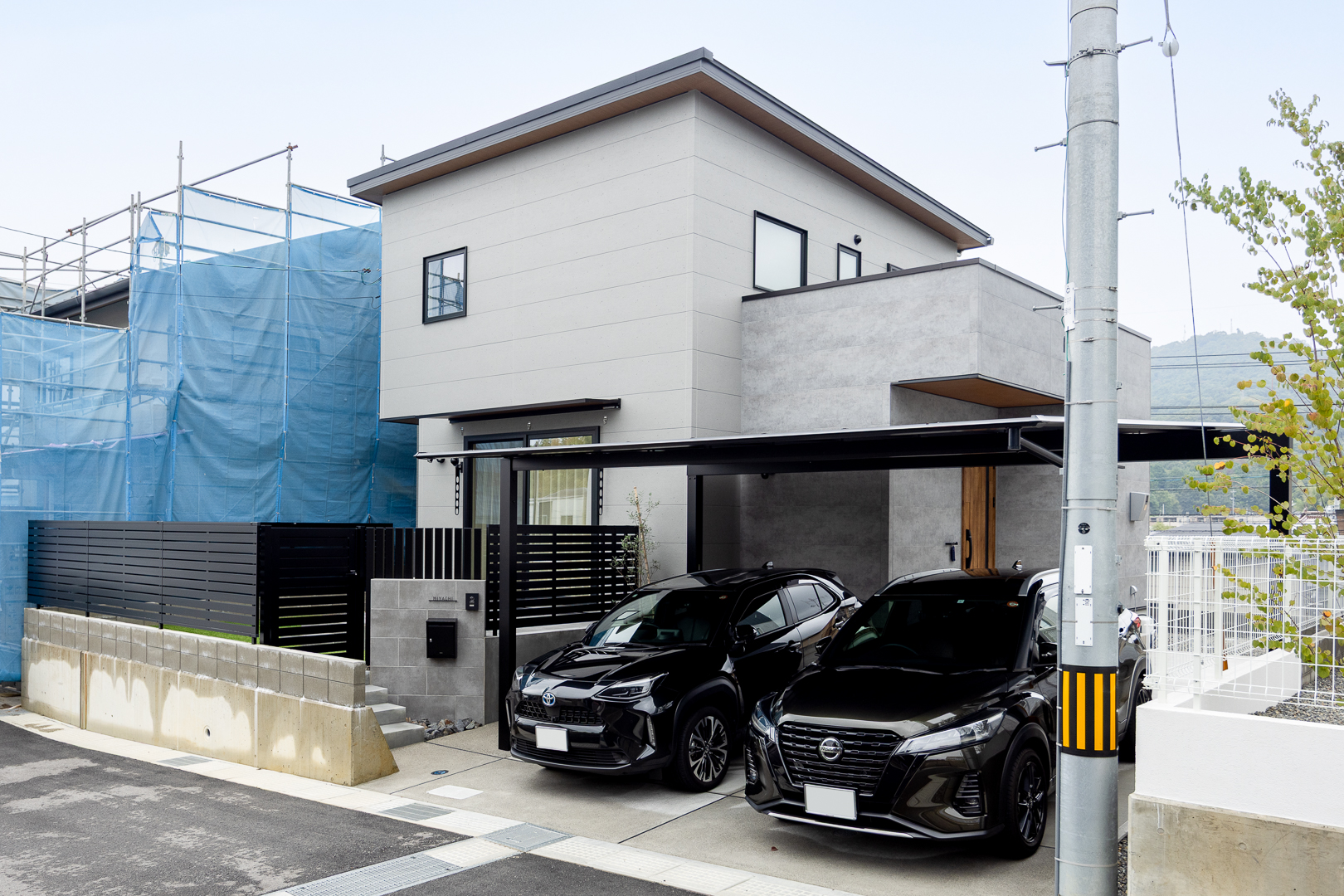 直線的でスタイリッシュな外観。落ち着いた色合いが街並みに馴染み、カーポート2台分で日常も便利に。