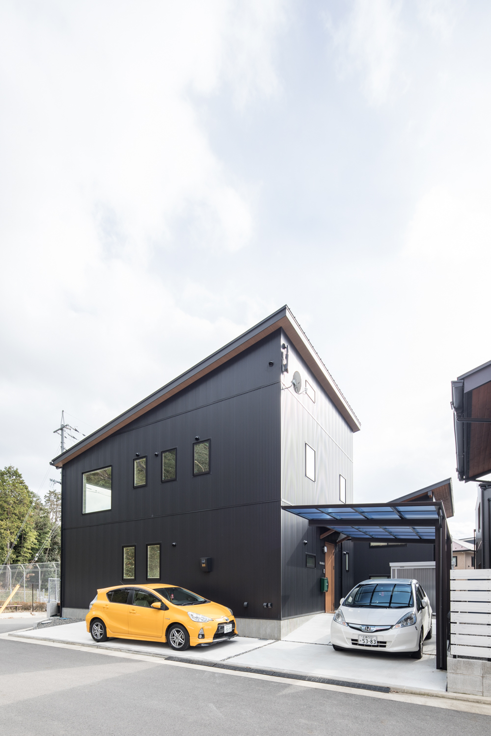外観は黒いガルバリウム鋼板にこだわった。グリーンの郵便受けとイエローの愛車がよく映える。家の裏側は木目をあしらっている。