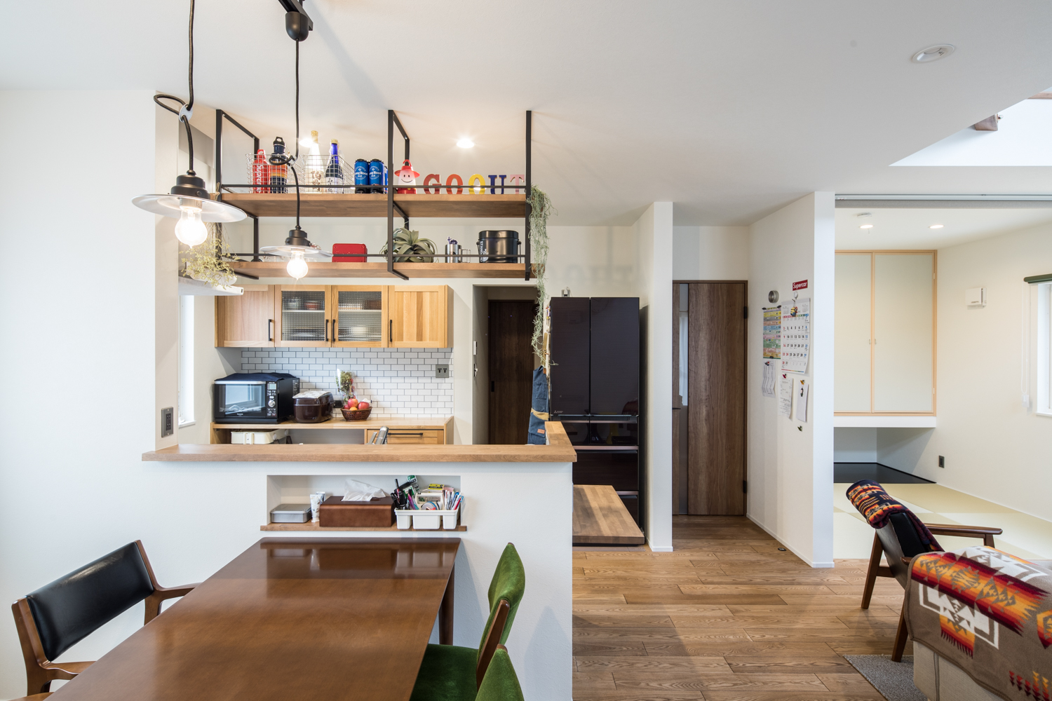 キッチンは便利な対面式。アイアンの吊り戸棚によって圧迫感のない空間になった。キッチンの奥は大型パントリー。玄関と直結した回遊できる動線をつくったので、とても便利なのだとか。リビングの奥には畳コーナーも設けた。