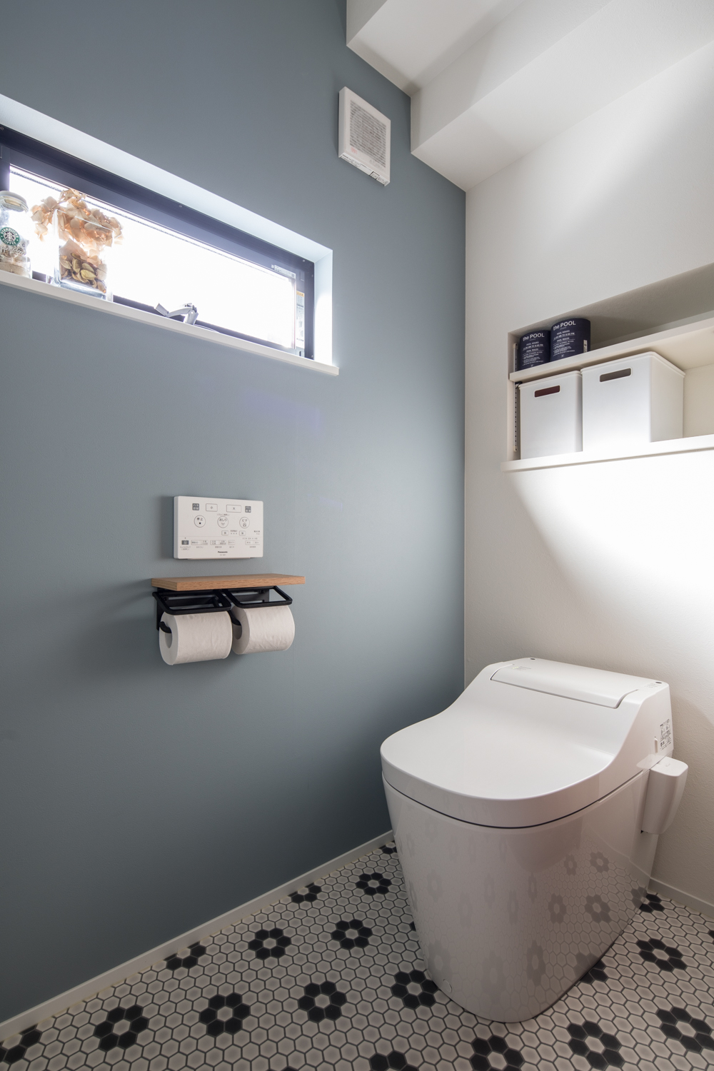 トイレのクロスを選んだのは奥様。床のタイル風のクッションフロアがお気に入り。