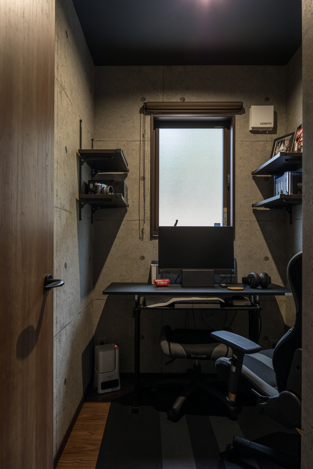 2階にはご主人こだわりの書斎を。映画を見たりゲームをしたりと、一人の時間を過ごすためコンパクトな空間が落ち着くそう。