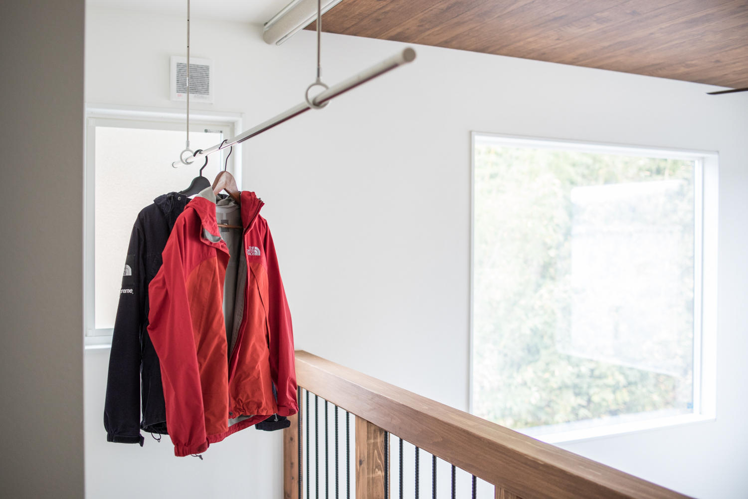 2階の吹き抜けにできた空間を物干しスペースに。吹き抜けに上昇した暖気によって洗濯物の乾きが速くて便利。