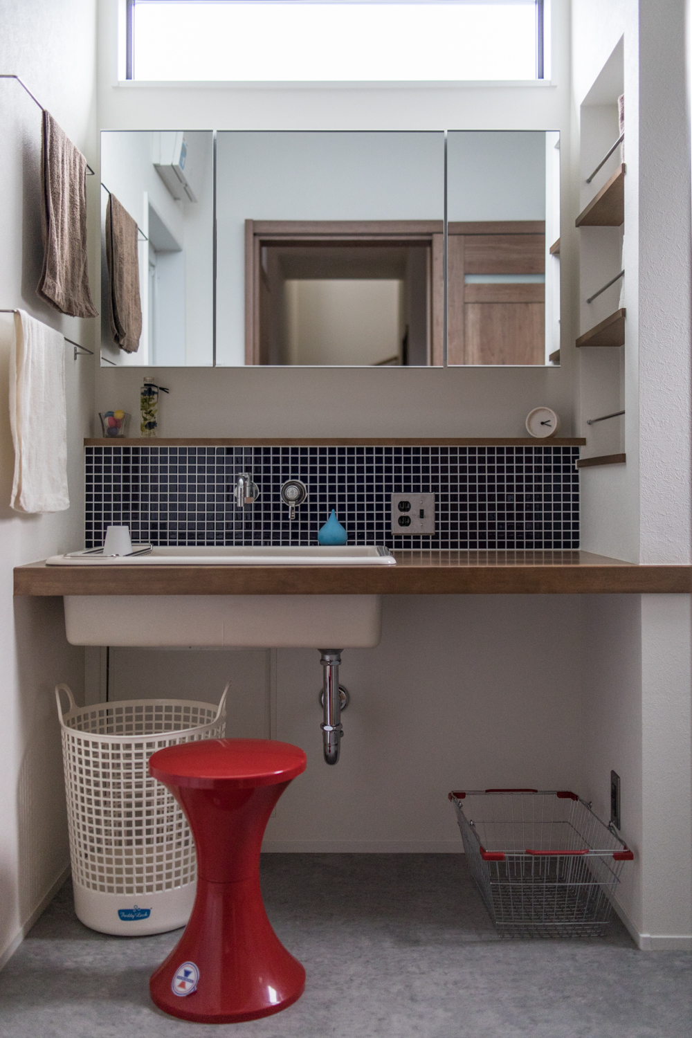洗面所のボウルは病院で使っているようなデザインのものをチョイス。朝、2人並んで使ってもゆったり。