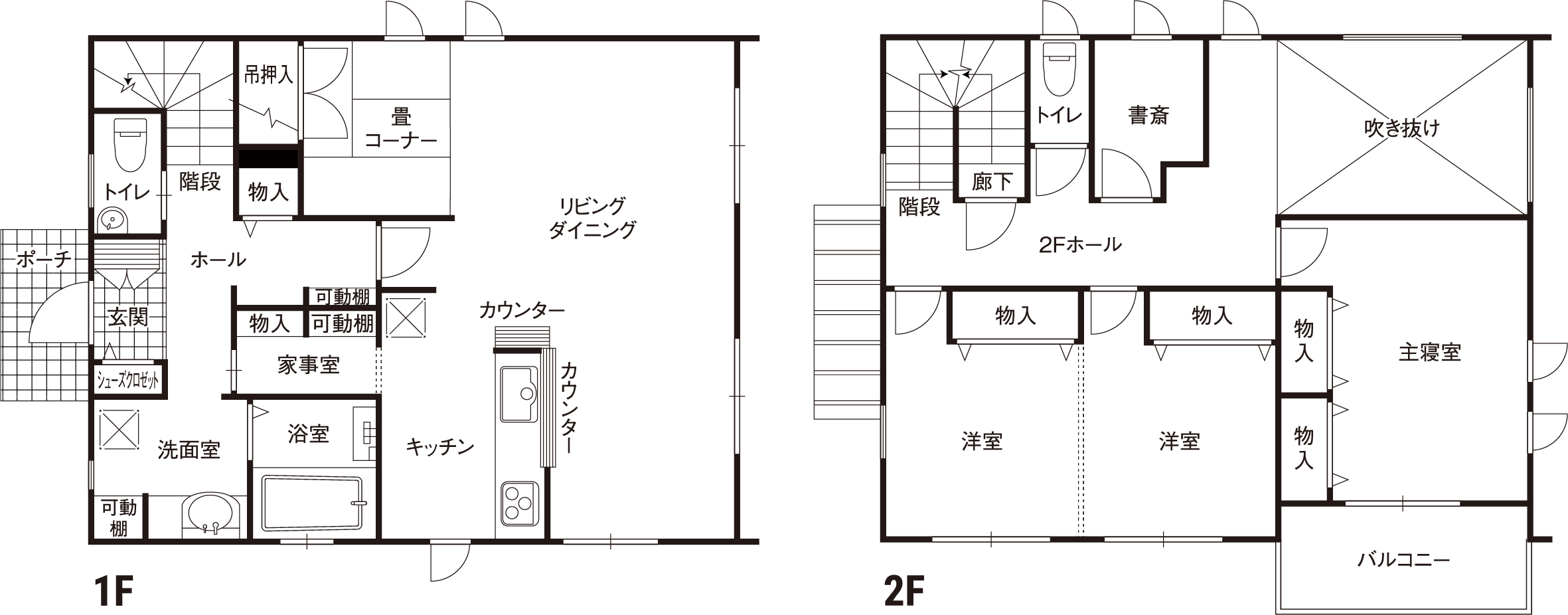 普段、食事作りはご主人、掃除と洗濯は奥様と家事分担をしている夫婦。室内干しできる2階の吹き抜けや週末にまとめ買いする食材をストックするたっぷりのパントリー、回遊できる対面式キッチンなど、家事をサポートする工夫も随所に。またご主人こだわりの書斎、奥様が気に入っている洗面所、黒いガルバリウム鋼板の外観など、夫婦それぞれの好みも形にしている。