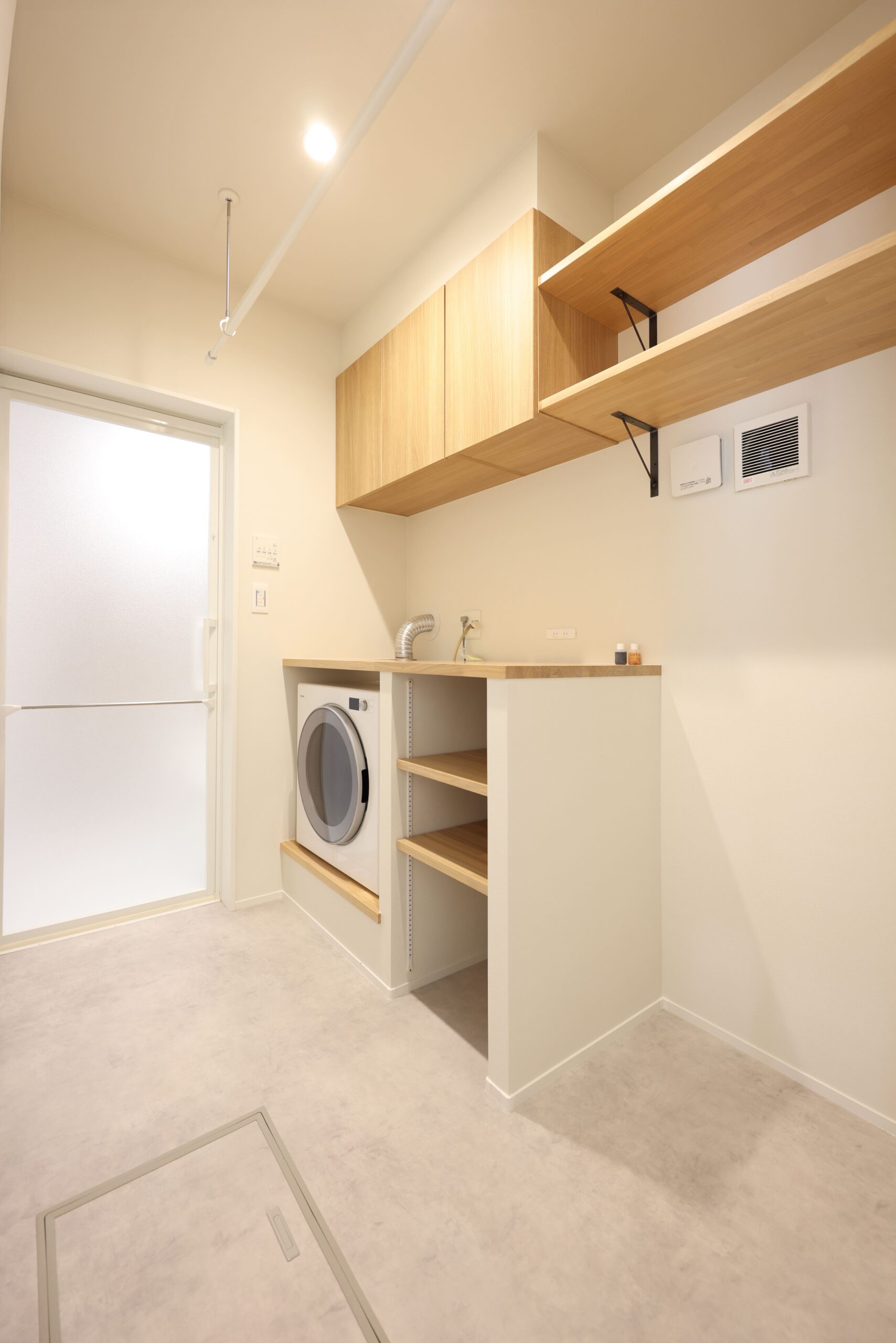 洗面所と脱衣所を分けて設計したランドリールーム。オリジナルの乾太くん棚や物干しバーを備え、洗う・干す・しまうがスムーズに。日々の家事が快適になり、趣味の時間を大切にできる暮らしを支える。