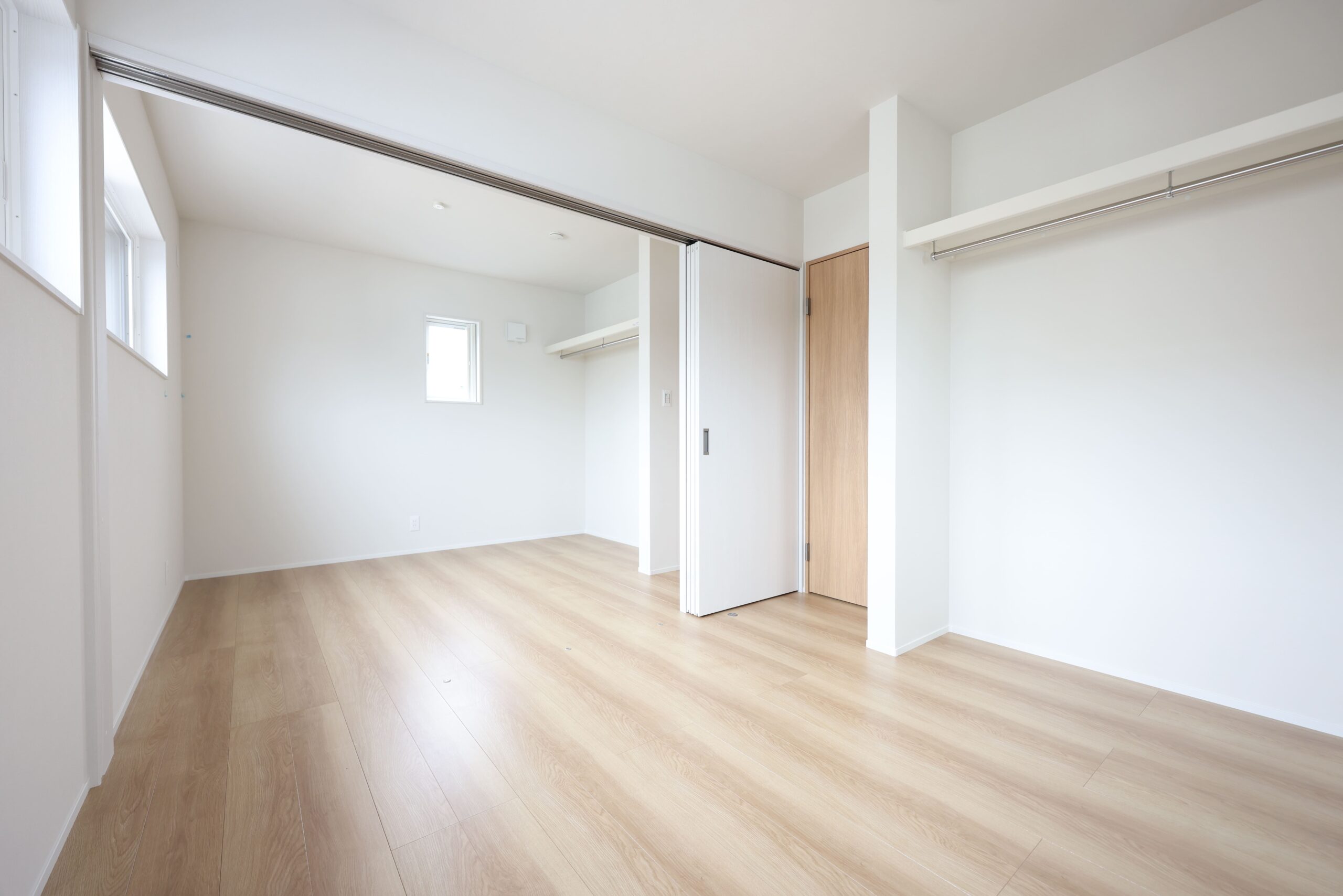 引き戸で開け閉めできる可変プランの洋室。今は広々と、将来は個室に仕切って使える。ライフステージの変化に合わせて柔軟に対応できる、将来に安心な設計。