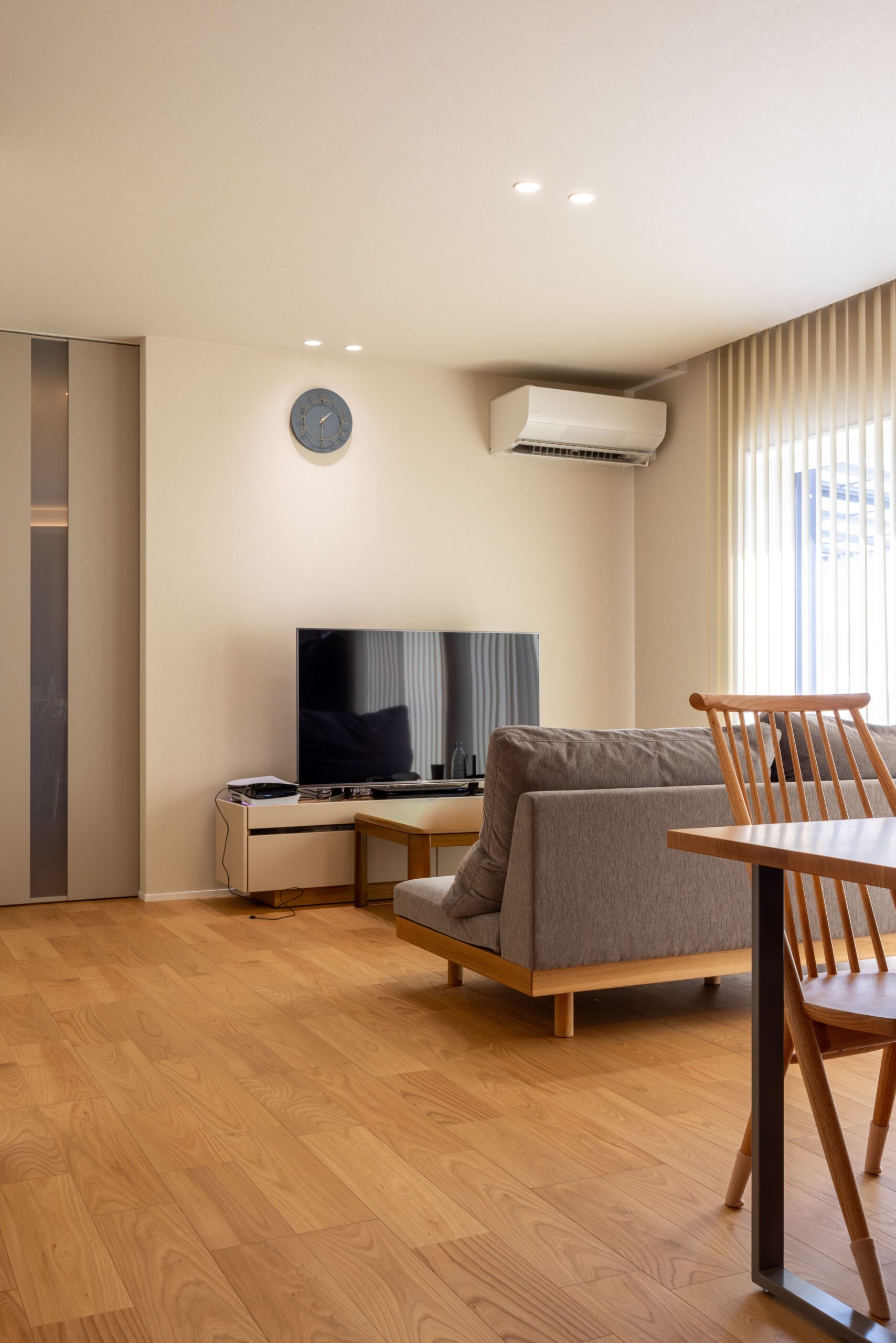 ブラインドから差し込む光がリビングをやさしく包みこむ。ダイニングテーブルやソファも日興ホームから提案され、こだわりのものを選んだ。