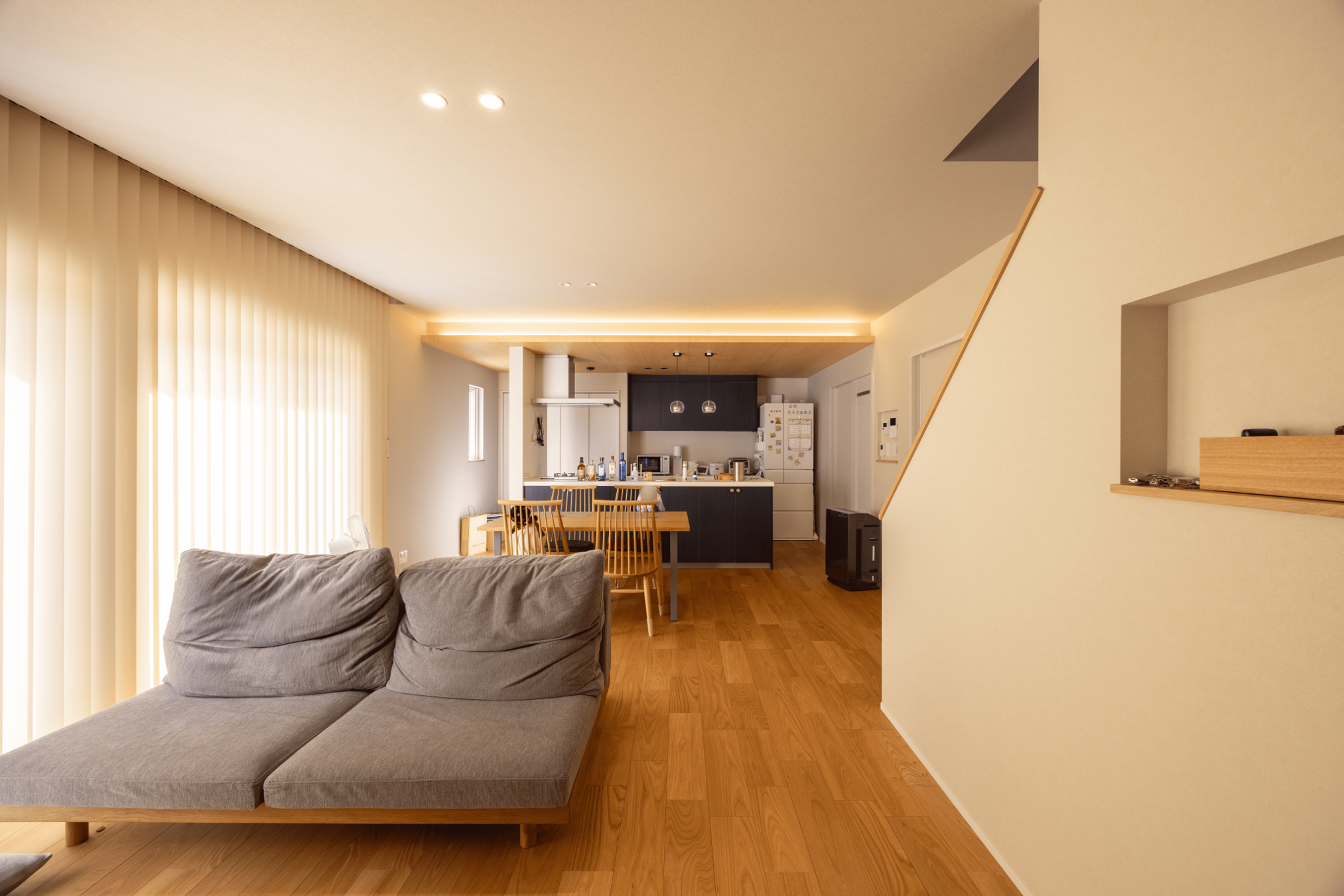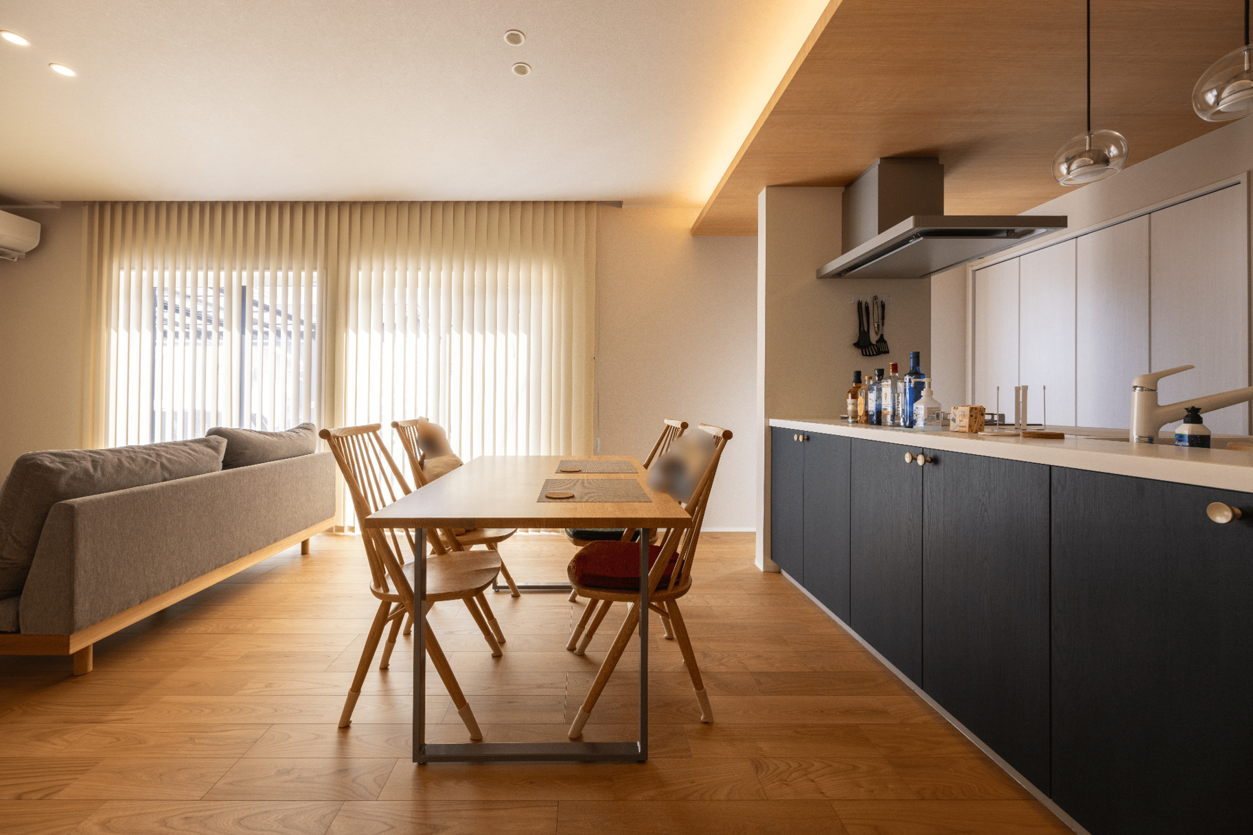 深いネイビーのキッチンと木目天井が調和し、落ち着いたリビングダイニングに。間接照明がやわらかな雰囲気を演出し、ご夫婦の趣味であるゲームや動画を楽しむ時間をより豊かにしてくれる。