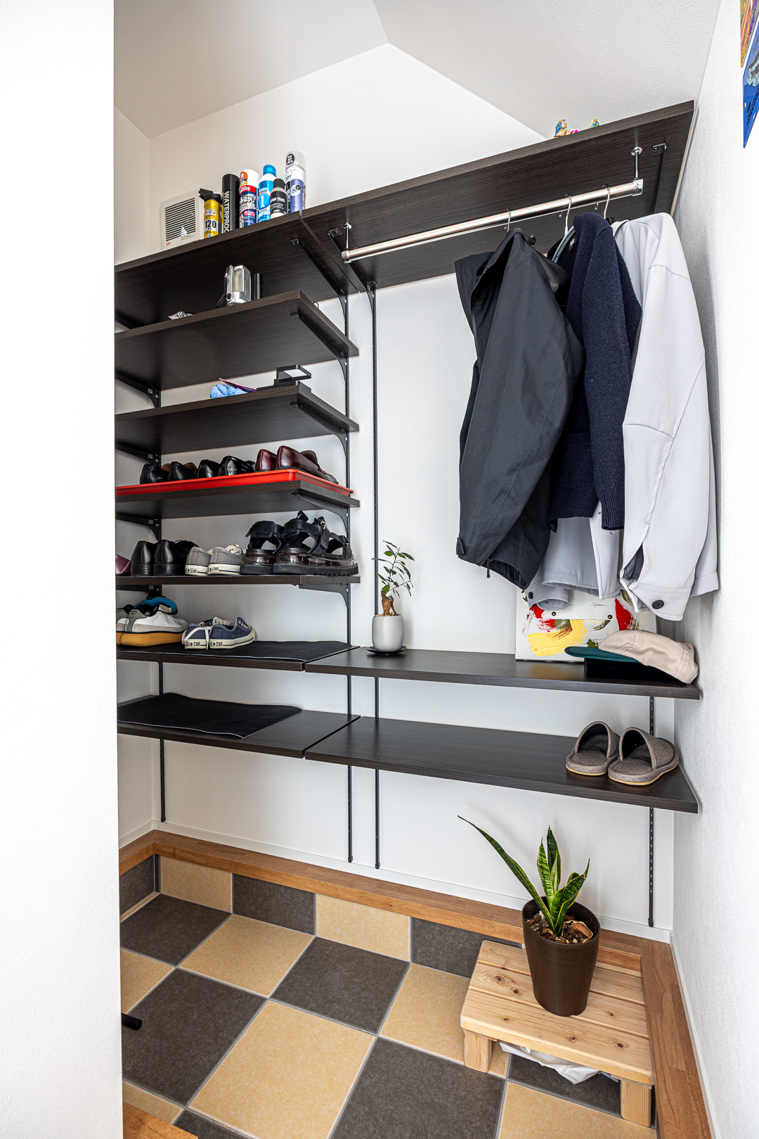 玄関は靴や上着までを収納できるウォークインタイプに。