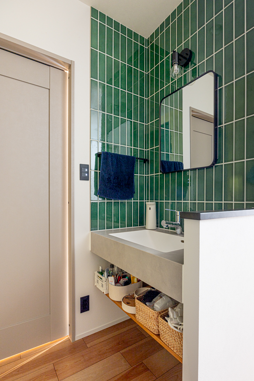 深い緑色の縦型タイルが印象的な洗面スペース。造作洗面台の下部にはオープン収納を設け、機能性とデザイン性を両立している。