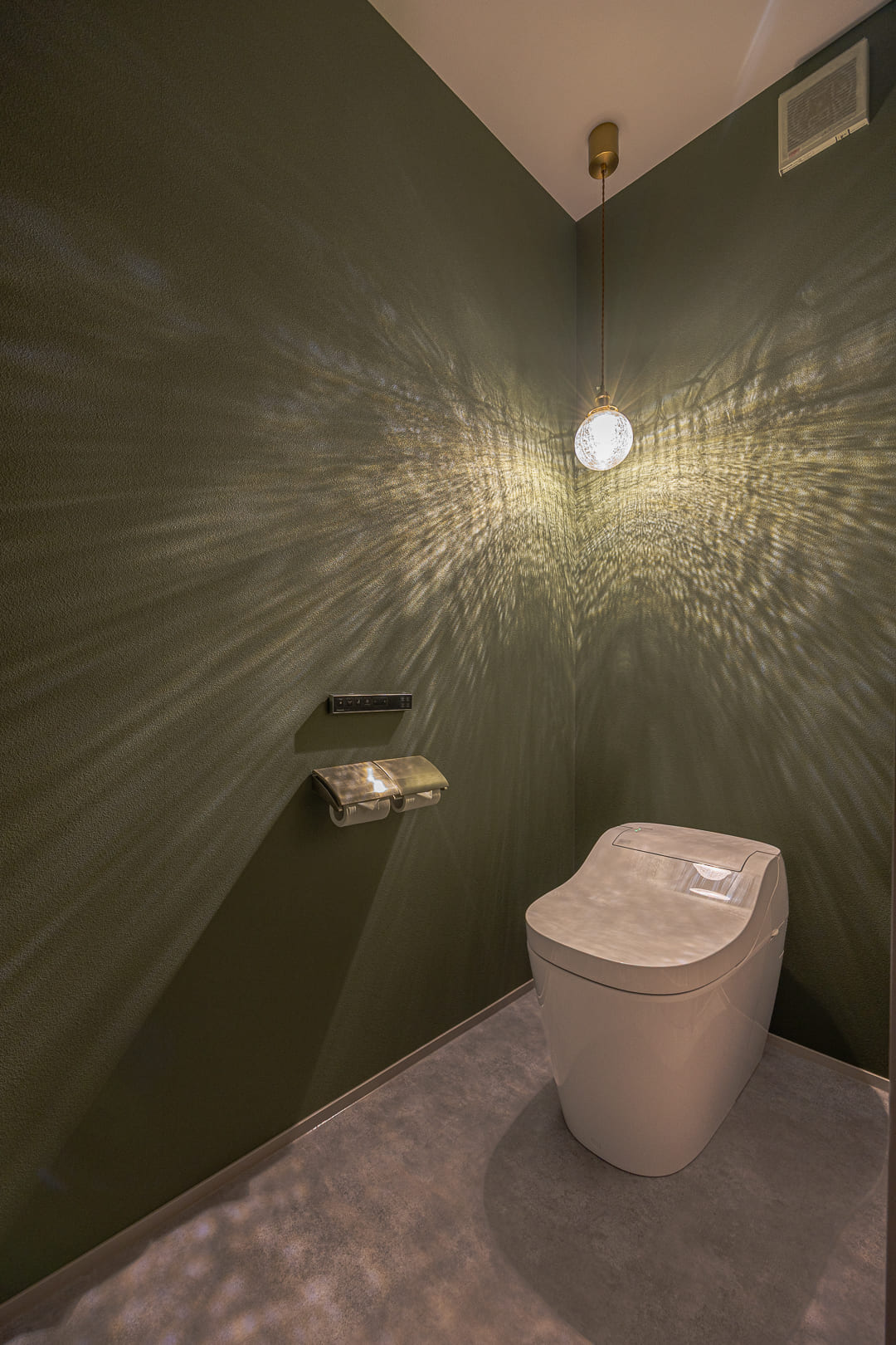 深い緑色のクロスが印象的なトイレ。天井から吊るされたペンダントライトが繊細な光の模様を壁面に投影し、空間に奥行きと劇的な表情を与えている。