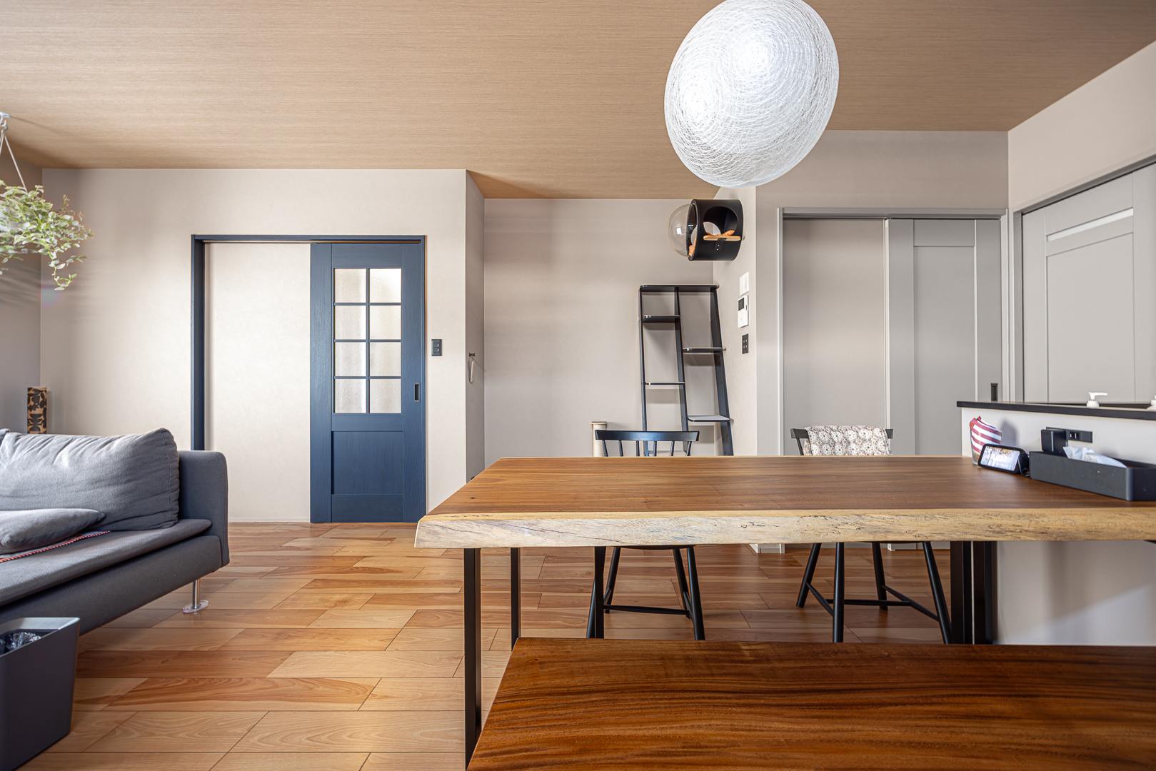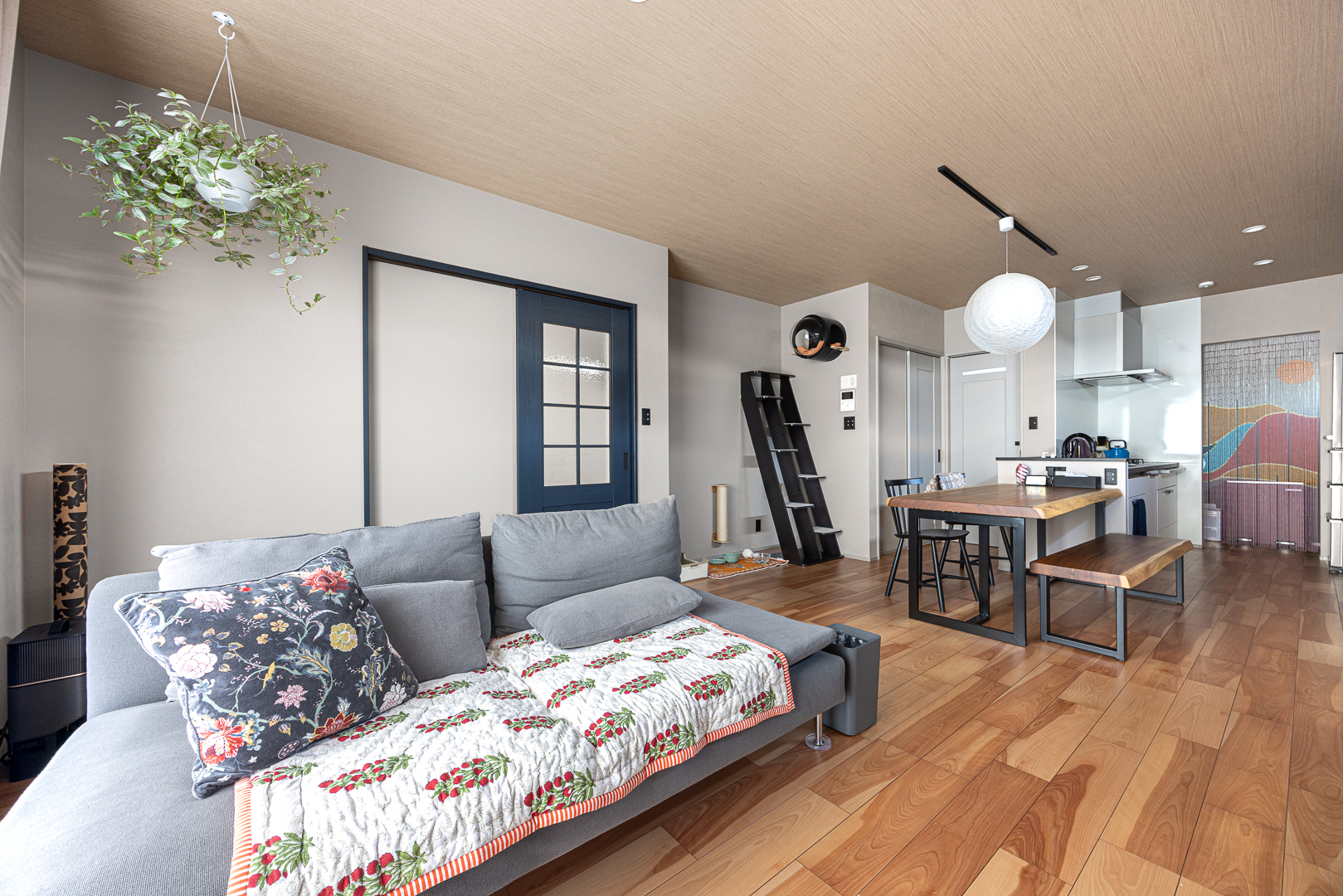 一枚板ダイニングテーブルが存在感を放つLDK。木目天井とフローリングが温かみを添え、グレージュの壁と黒のアクセントがモダンな雰囲気を演出。奥には猫ちゃんコーナーが見える。