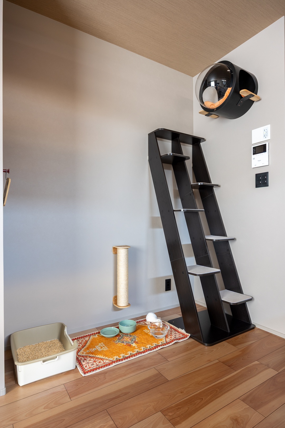 愛猫のための専用スペース。黒い斜めのキャットステップで上下運動ができ、壁には丸い猫用ベッドや爪とぎを設置。