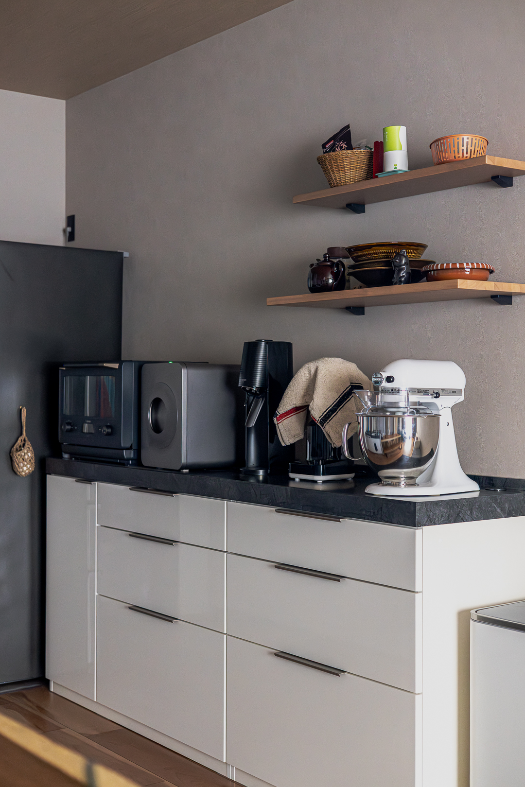 白いキャビネットに黒の天板を組み合わせたカップボード。オープン棚には食器類が並び、カウンターにはこだわりの調理家電が並ぶ機能的な空間だ。