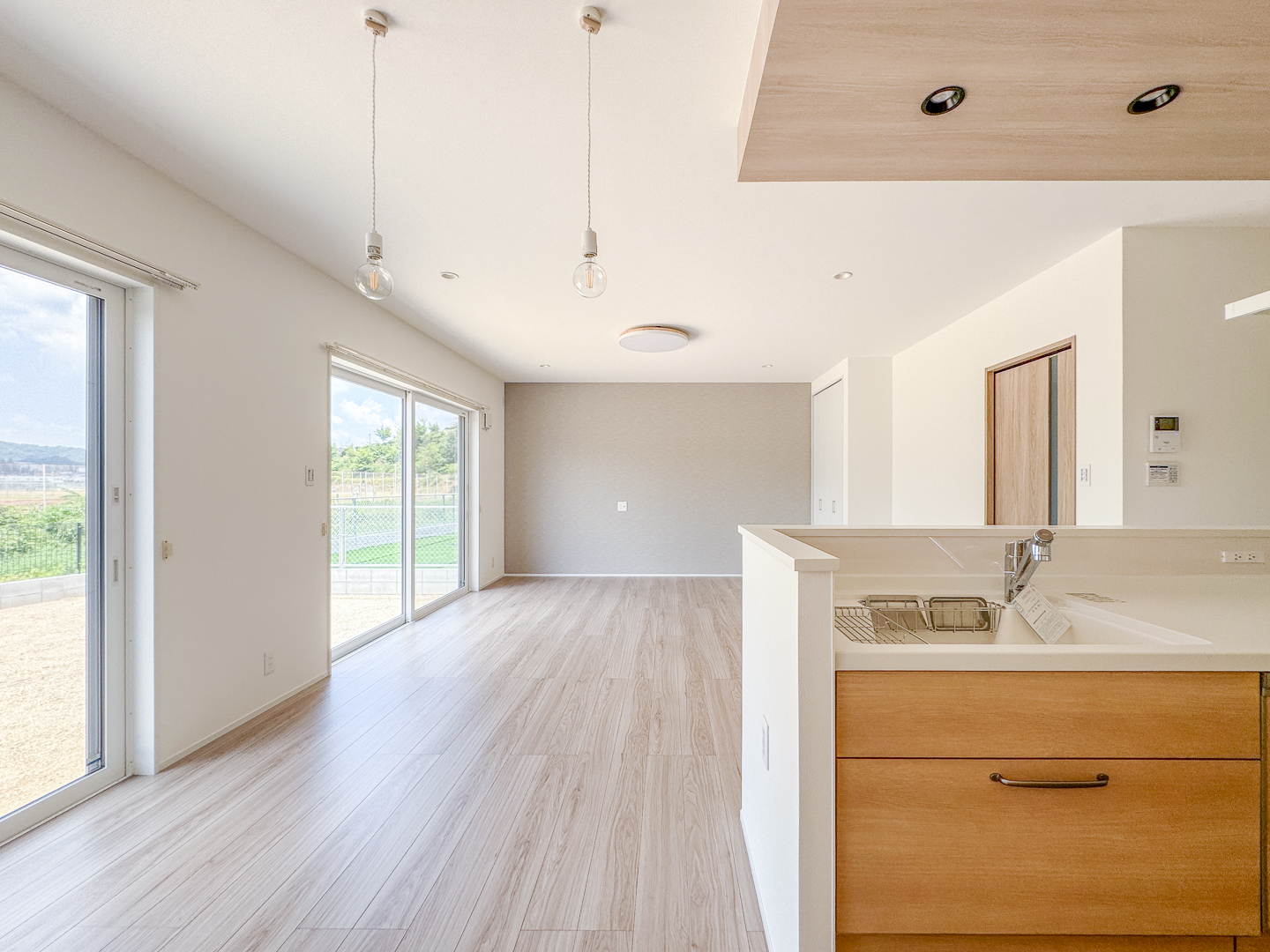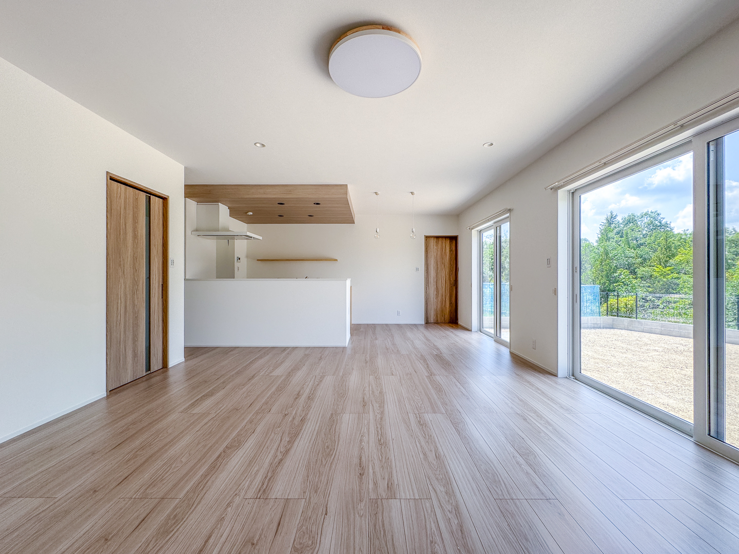 庭に面した大きな開口から光と風をたっぷり取り込むLDK。家具を置いても余白が残る伸びやかな奥行きで、家族が自然と集まる気持ちのいい場所に。