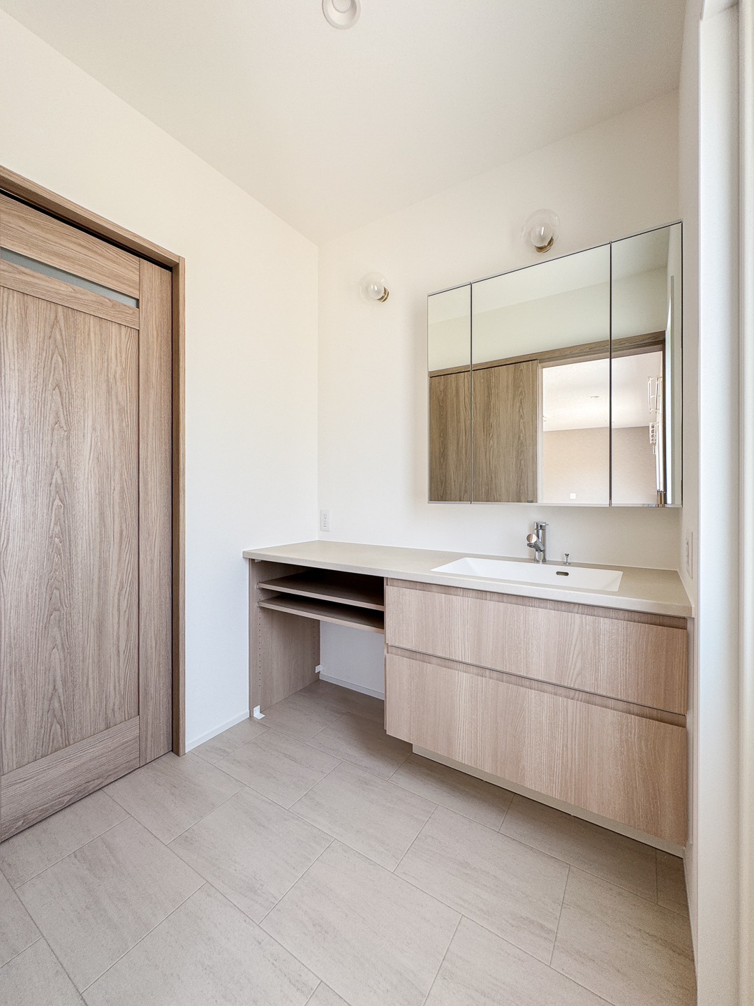 幅広カウンターと三面鏡で朝の支度も並んでスムーズ。