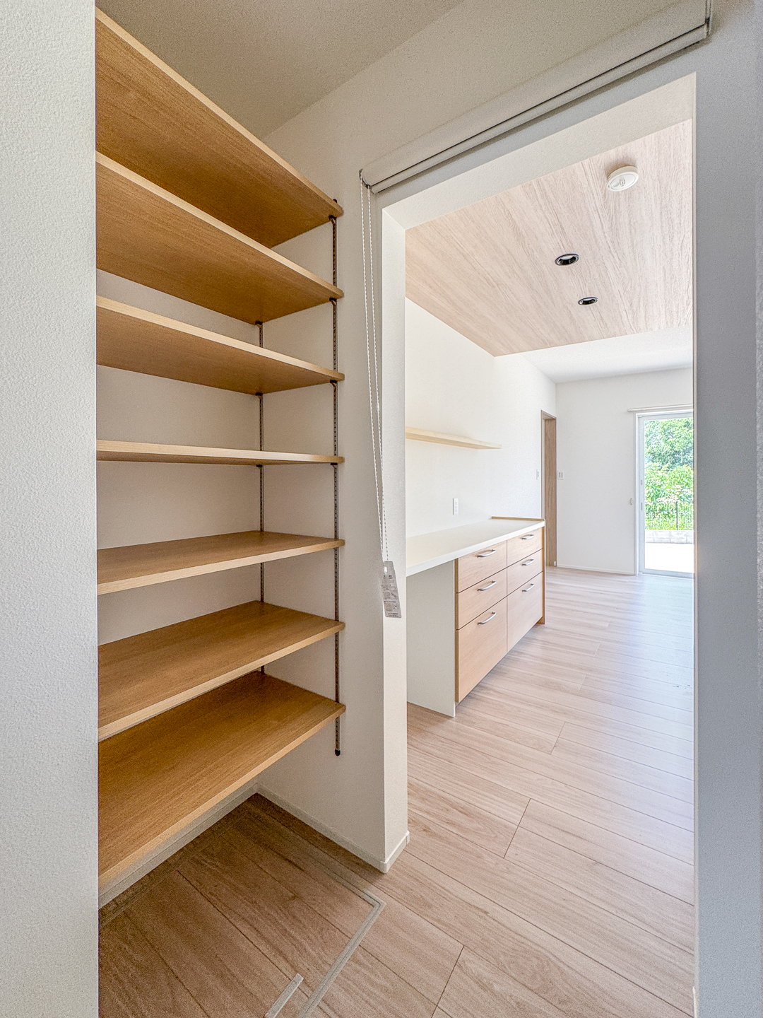 キッチン横に設けたパントリーは可動棚で高さ調整が自由。買い置きや調理家電をすっきり収められる。